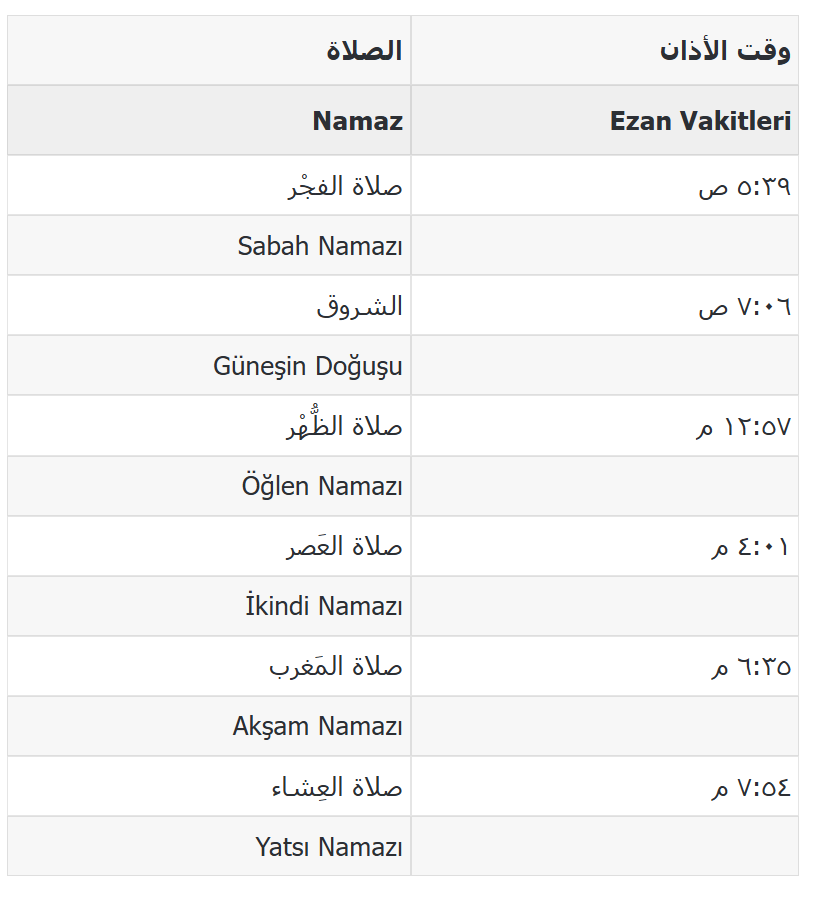 ÖRNEK ARAPÇA NAMAZ VAKİTLERİ