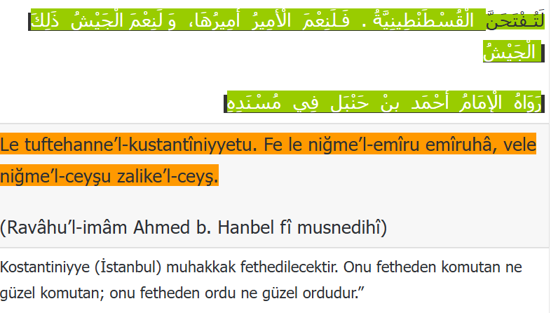 لَتُـفْتَحَنَّ الْقُسْطَنْطِينِيَّةُ . فَـلَنِعْمَ الْأَمِيرُ أَمِيرُهَا، وَ لَنِعْمَ الْجَيْشُ ذَلِكَ الْجَيْشُ رَوَاهُ الْإِمَامُ أَحْمَد بِنْ حَنْبَل فِي مُسْنَدِهِ |