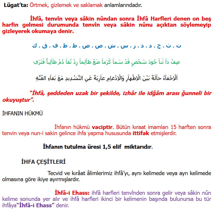 İhfa: lügatta: “Örtmek ve gizlemek” demektir. Tecvid ilminde