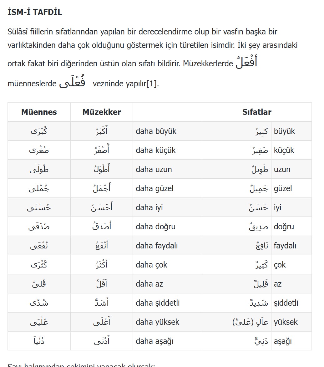 (a) Müzekkerleri: ( كَبِيرٌ büyük), ( أَكْبَرُ مِنْ …den daha büyük), ( اَلْأَكْبَرُ en büyük) ve