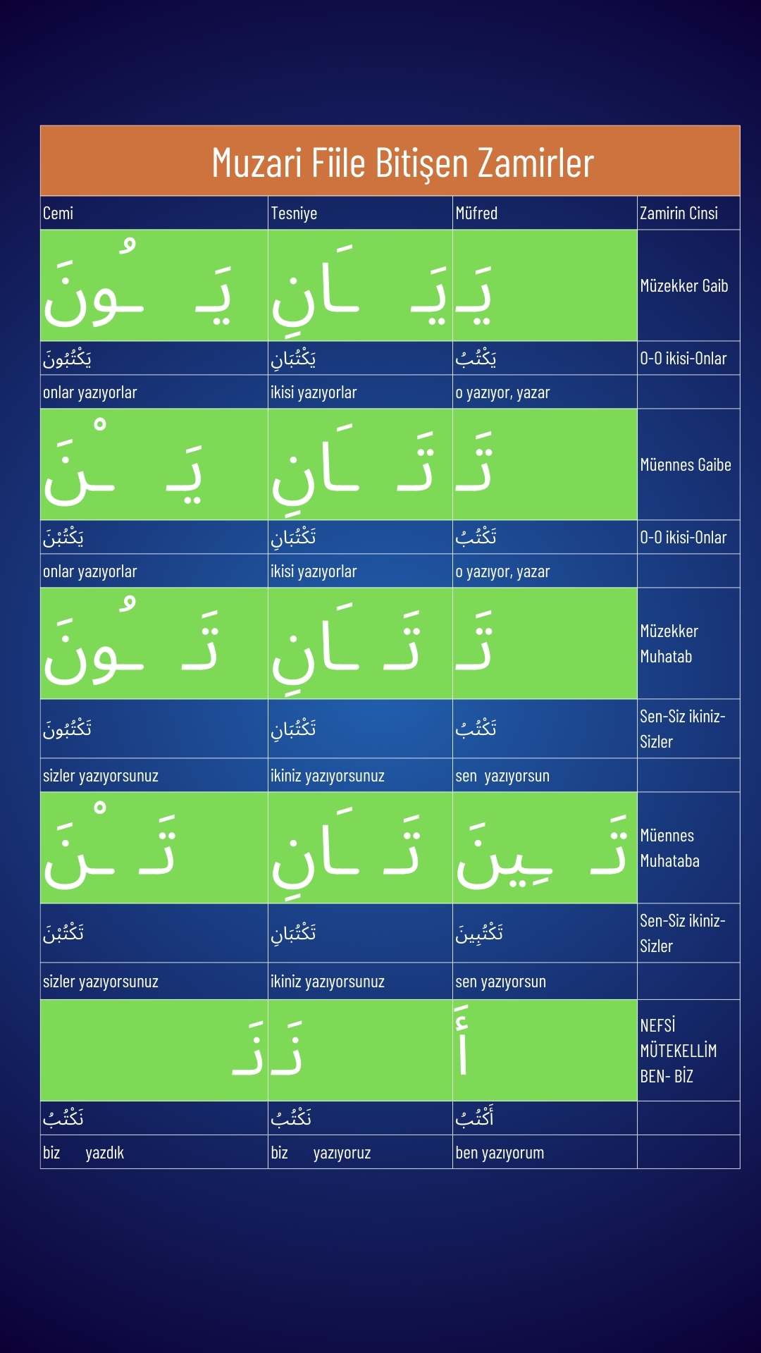 | تَـ (te..) | Müfred (Tekil) | تَكْتُبُ (tektubu) | o yazıyor, yazar |
